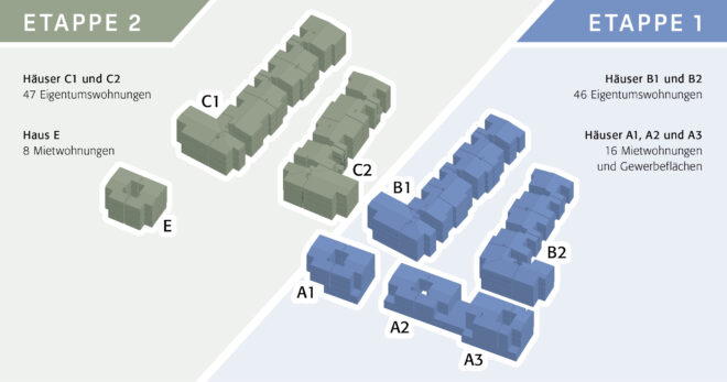 Acht Mehrfamilienhäuser mit total 117 Wohnungen, Gewerbeflächen und einer zentralen Tiefgarage.
